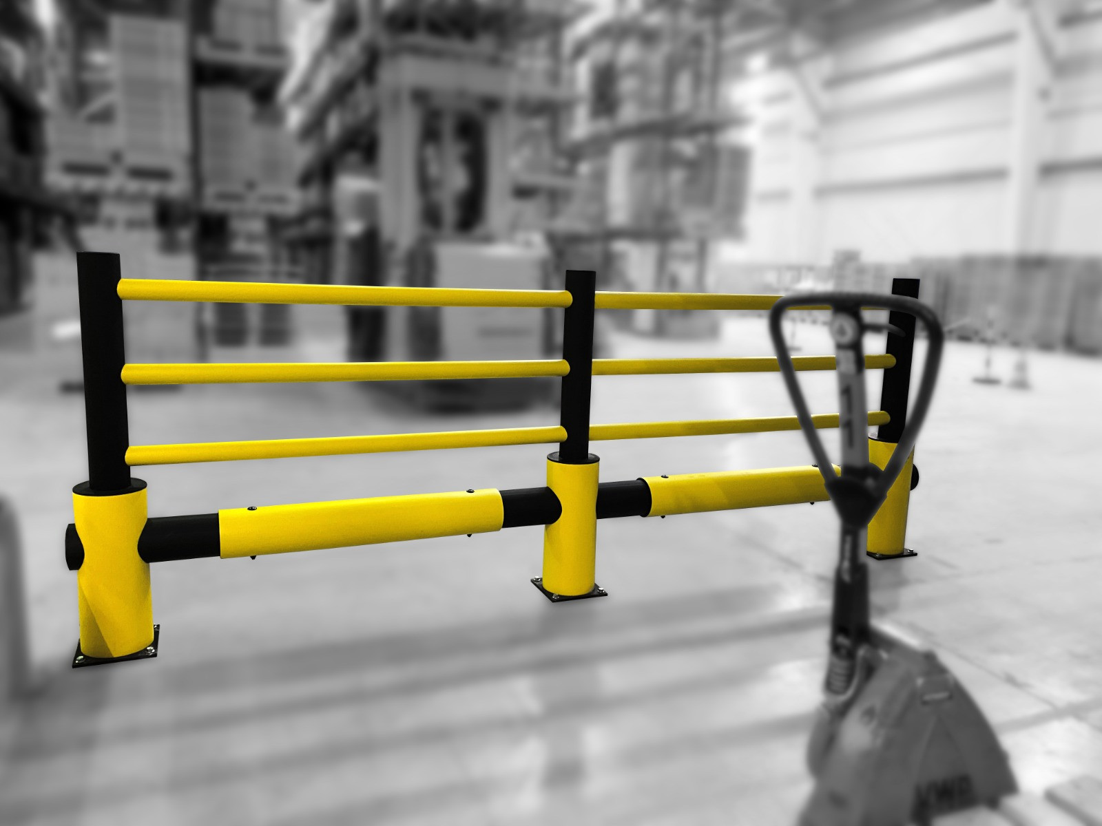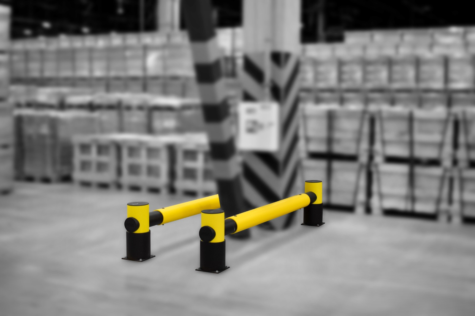 The industrial safety barriers featuring a deformable polymer material and rounded design will effectively protect the forklifts and pallet trucks from potential collisions.