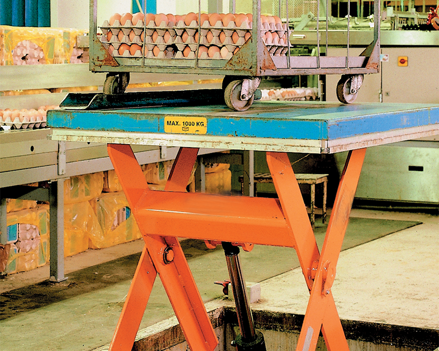 Scissor lifting tables of the TL lifting table series with simple scissor mechanisms are available in different designs and sizes, with a maximum lifting height of up to 3,000 mm. They have been specifically designed for areas where heavy and differently sized workpieces are moved and processed. They are used in production, maintenance as well as logistics, with the maximum carrying capacity being 10,000 kg. A special stainless-steel version for food operations supplements the many standard versions.