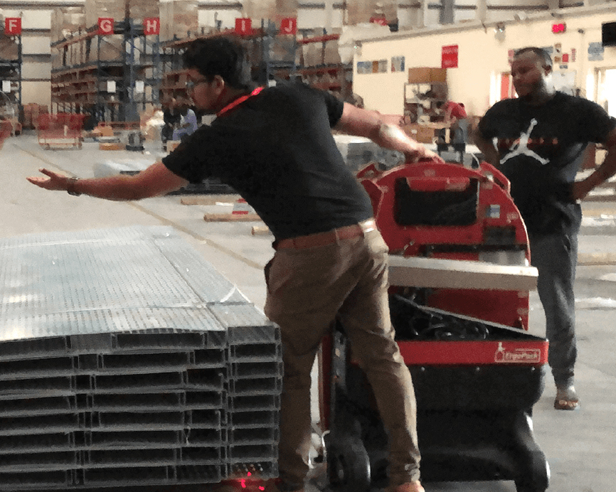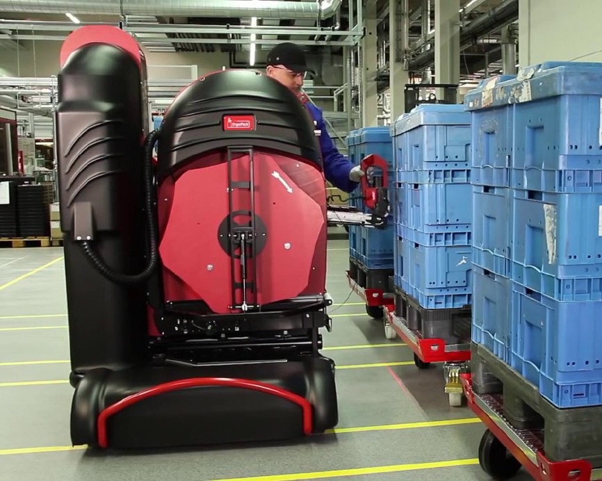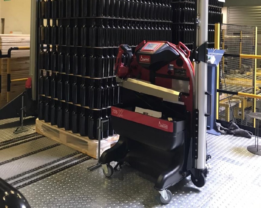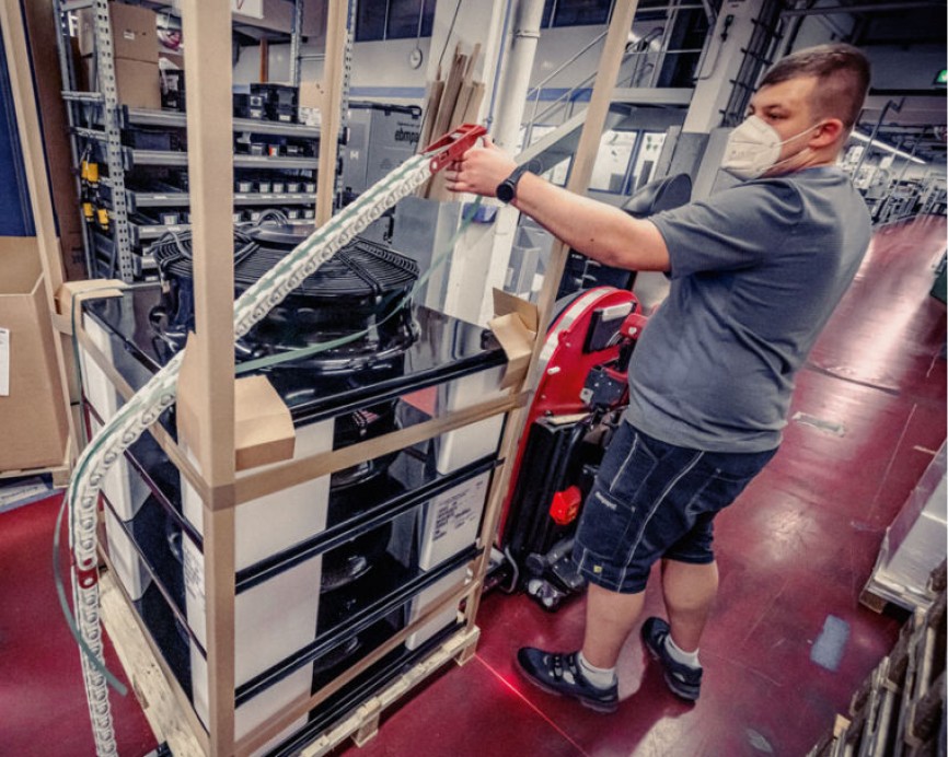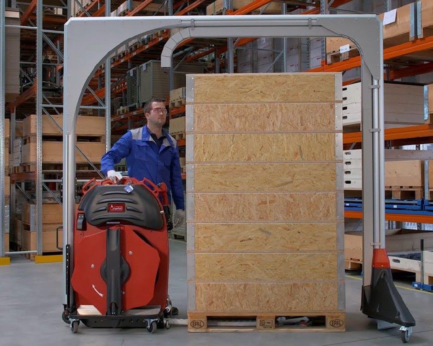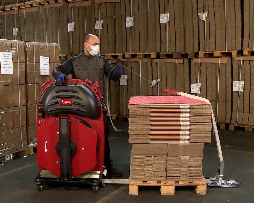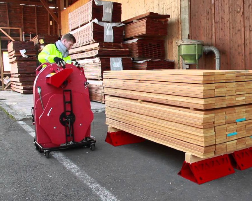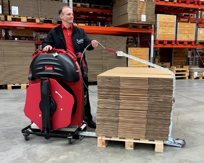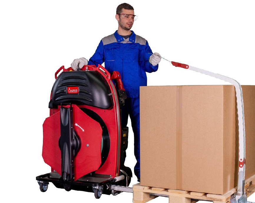 With the mobile strapping machine of ErgoPack different sized pallets can safely and comfortably be strapped with plastic straps – standing upright, without bending and walking around the pallet. The patented ChainLance which is guiding the strap below the pallet, upwards at the opposite side, and directly into the hands of the user.