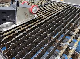 The tool is moved along the slats on the bed of a laser machine to remove slag that accumulates while cutting. Rotary cutting tools ride on each side of the slat to lift and remove the slag. It may be used on steel, copper, or hybrid steel/copper slats. When not in use it may be rolled along the floor and stored in an upright position.