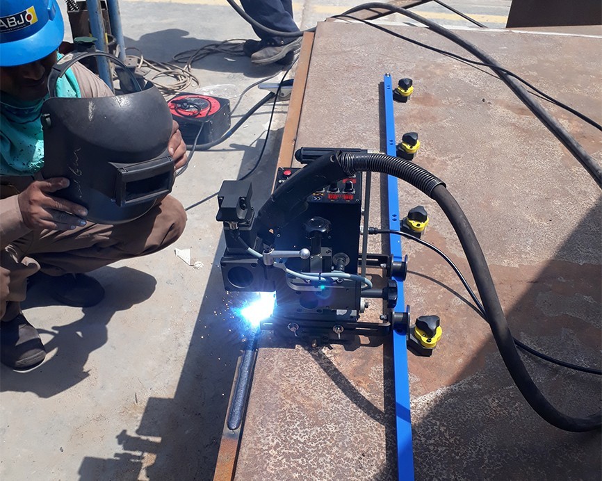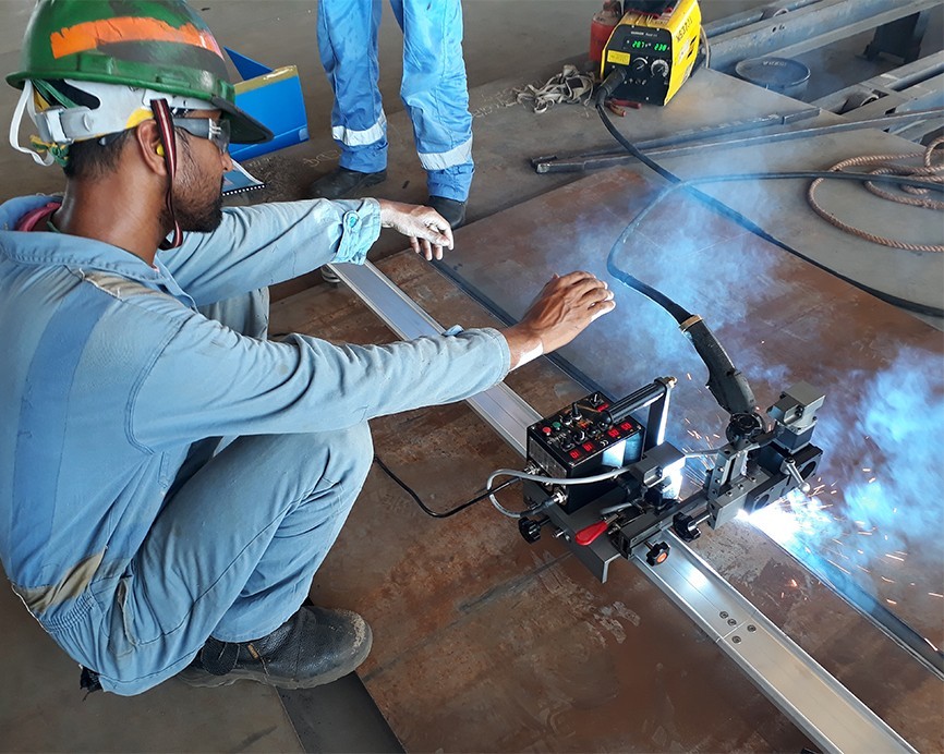 Welding Carriages & Weavers assist the professional welder in maintaining a safe and high-quality weld in Dubai, UAE. Sometimes referred to as semi-automation, the portable welding carriages make welding easier for the welder because the torch movement is now mechanized and controlled. This allows the welder to concentrate on the weld parameters and bead creation avoiding uncomfortable positions, weld heat & fumes, while manually welding. By maintaining a consistent torch tip distance, the arc voltage remains the same. Speed controls maintain an even weld bead and penetration; this reduces over-welding and, in turn, reduces costs. Distortion is controlled by maintaining a constant heat-affected zone. Wire and gas waste is reduced as only the determined amounts of these are applied to the weld bead. Welding carriages can be used for MIG, FCAW welding. Besides lateral motion, many weld carriages can be assigned parameters to control other variables in the welding process.